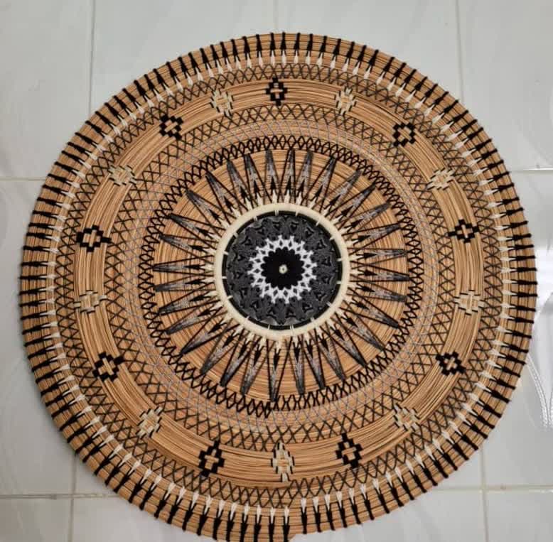این دیوارکوب با نوارهایی از چوب میوه نخل ساخته شده است و روی آن بافت گلیمی کار شده است. وزن کار سبک و زیر 300 گرم می باشد و قطر کار 64 سانتی متر است.